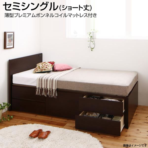 組立設置付 日本製 収納ベッド セミシングル ショート丈 薄型プレミアムボンネルコイルマットレス付き 幅83×長さ185×高さ80cm 小さめ 小さい 短い 狭い コンセント付き 引出し付き 子供部屋 子供ベッド 男の子 女の子 女性 ベッド下収納 大容量 チェストベッド