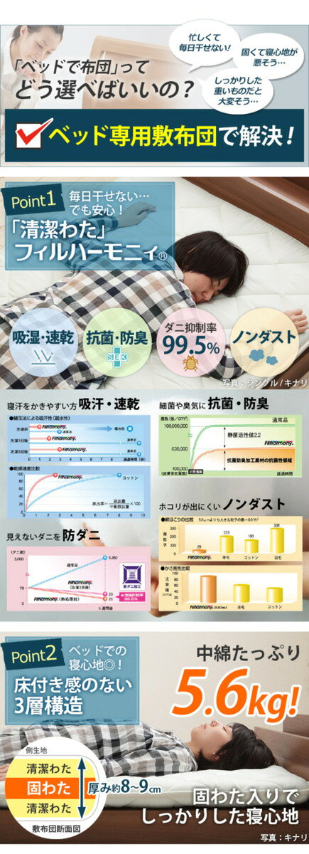商品説明(spec等)商品詳細【カラーバリエーション】ブラウン・キナリ【仕様】側地:ポリエステル100%(ブロード)中綿:ポリエステル100%抗菌防臭加工・防ダニ加工【サイズ】本体:約210x140cm・厚み約9cm重量:約7kg中綿:ポリエステル綿+中空綿約2.8kg/固綿約2.8kg送料全国一律無料(沖縄・離島は配達不可)備考※お急ぎの場合は必ず事前に在庫確認を行って下さい。