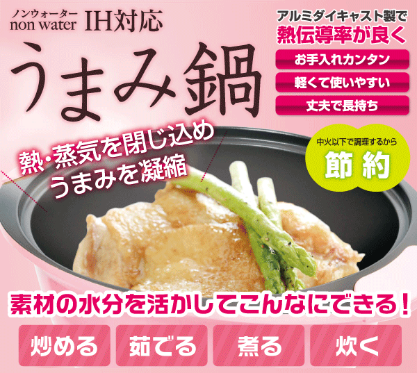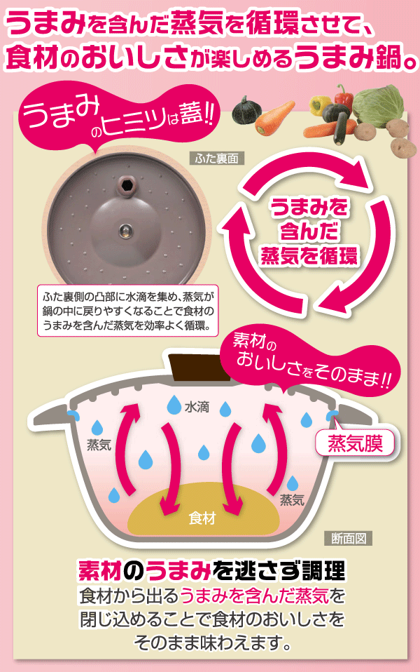 商品情報 食材のうまみを含んだ蒸気を循環させてそのままのおいしさで調理できるお鍋! 食材から出るうまみを含んだ蒸気を逃さず閉じ込めることで食材のおいしさをそのまま味わえます。